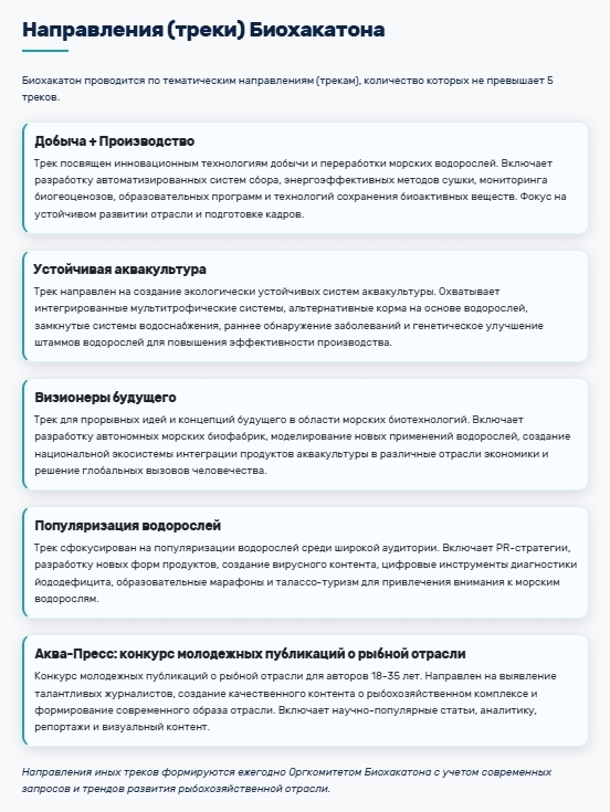 Победители конкурса были определены по 5 тематическим направлениям: «Популяризация водорослей», «АкваПресс»: конкурс молодежных публикаций о рыбной отрасли, «Добыча + производство», «Устойчивая аквакультура», «Визионеры будущего».