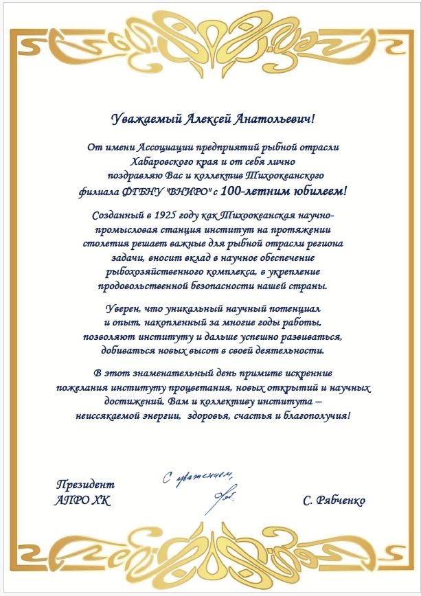 Поздравление от Ассоциации предприятий рыбной отрасли Хабаровского края: