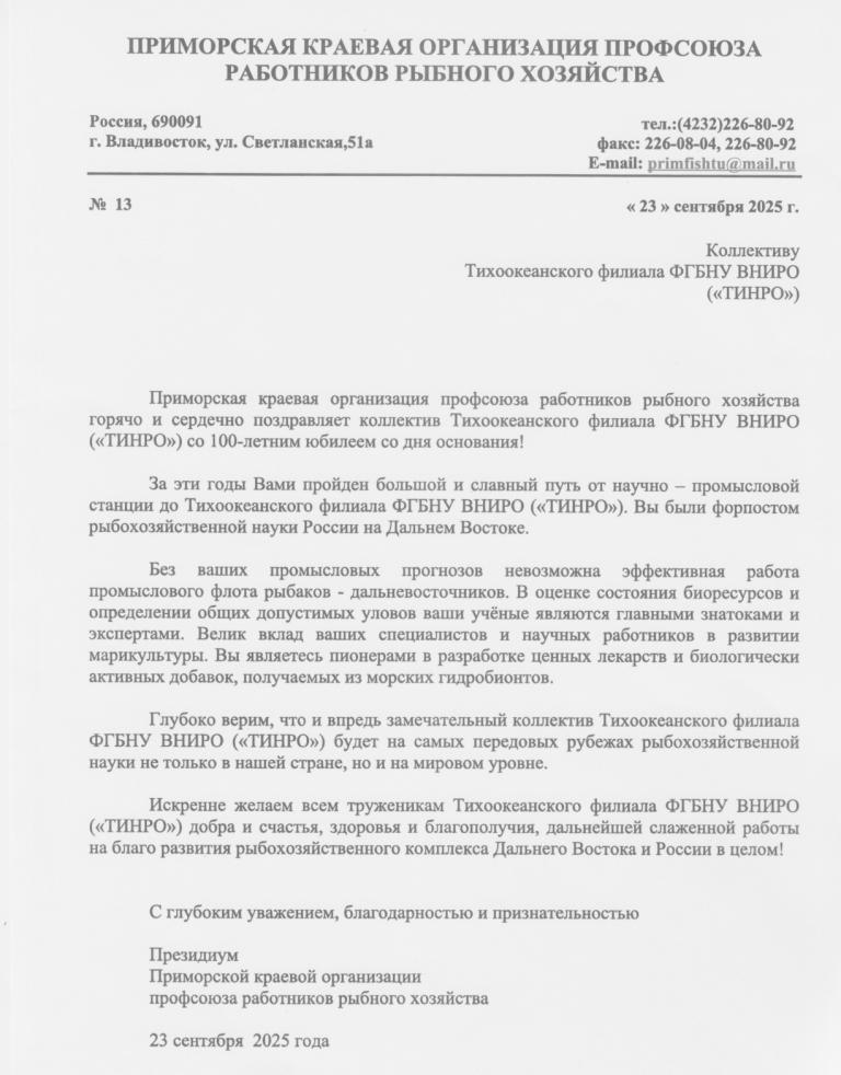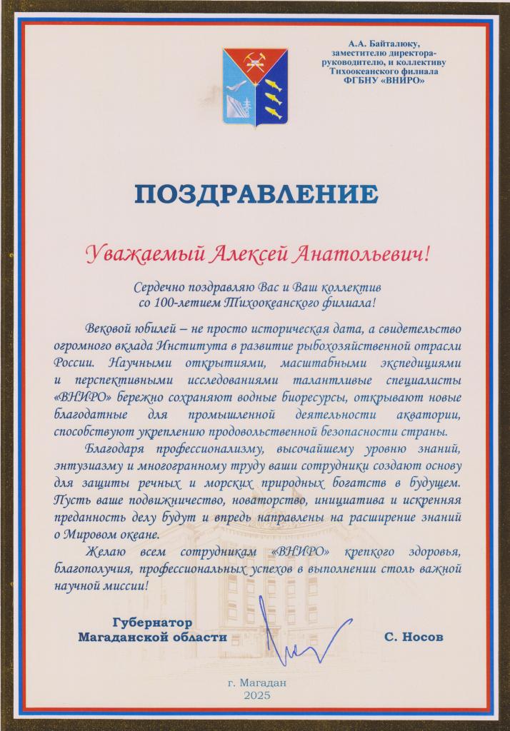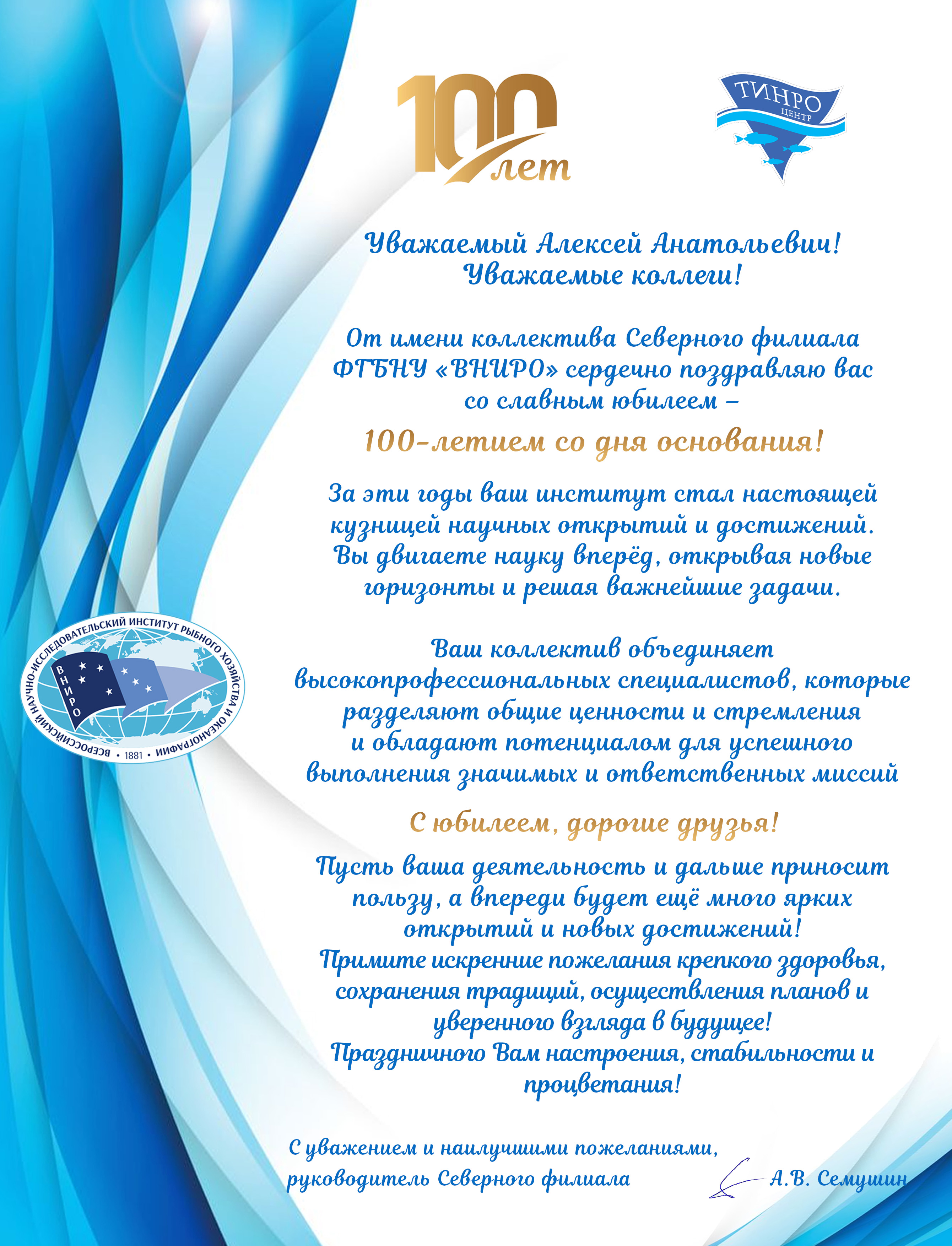 Сердечно поздравляю коллектив и ветеранов Тихоокеанского филиала ВНИРО со 100-летием со дня его основания!